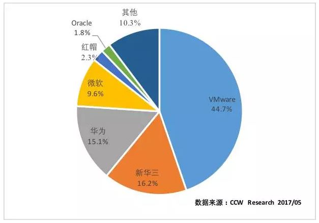 報告顯示,從市場份額角度看,2016年,VMware仍然占據中國服務器虛擬化市場第一的位置,但市場份額從前一年已的47.8%降到了44.7%。新華三則從前一年的13.8%上升到16.2%,華為的份額同樣有所增長,而Citrix則跌出了單獨列出的前六名廠商之外,產品重心更加傾向于桌面及移動IT產品。